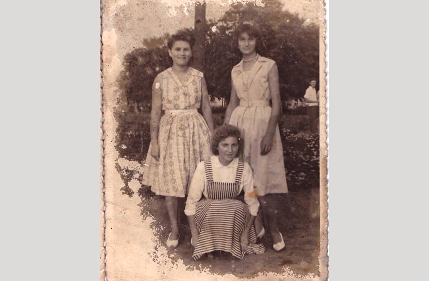 Ana Kalić (prva s desna), Ana Dogan (čuči) i Radovanka (prva s leva) čije prezime nismo uspeli da saznamo. Ana Kalić je bila ćerka Ivana i Marice (rođ. Grgić) Kalić. Radila je u starčevačkoj školi kao sekretarica, a bila je knjigovođa. Kasnije je bila premeštena u Pančevo, u muzičku školu. Ana Dogan je ćerka Jose i Marice (rođ. Kalić) Dogan. Radila je kao kuvarica u Pančevu. Radovanka je radila u Opštini Pančevo.